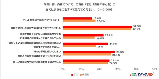 - 高校生の4人に1人が短期詰め込み学習の傾向高校生の25.0%が「テスト勉強を一夜漬けでやっている」と回答した他、「宿題を提出直前にまとめてやる」は学生37.5%、保護者37.1%と「短期まとめ型学習」となりやすい傾向が明らかに。