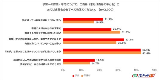 - 「苦手は避ける」が最多、学生・保護者4割超に広がる回避型の学習姿勢が努力のハードルに「『苦手』と思ったことはチャレンジせずに避けてしまう」が学生42.4%、保護者42.6%と、苦手に向き合う前に回避してしまう学習姿勢が家庭内に広がっていることが分かった。