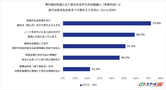 一方で、スクールIEの教室長・講師に対し、「成績が伸び悩む生徒によく見られる学習方法」を聞いたところ、「単語や公式はノートに書かず、見て(読んで)覚える(72.0%)」が最も多く、学生・家庭では気づきにくい、努力のつまずきポイントとして認識されていることが分かりました。他にも「ノートをきれいにまとめただけで勉強した気になってしまう(58.7%)」、「解答を丸暗記しており、数字や形式が変わる応用問題に対応できない(51.2%)」があげられました。