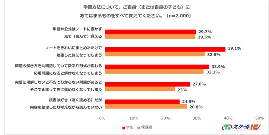 学生・保護者を対象に、「自分自身、または自身の子どもに当てはまる学習方法」について質問したところ、第一位は「ノートをきれいにまとめただけで勉強した気になってしまう」で学生39.1%、保護者32.5%という結果に。次いで、「問題の解き方をそのまま丸暗記しているだけで、数字や出題形式が変わる問題(応用問題)になると解けなくなってしまう」は学生33.9%、保護者32.1%、「単語や公式はノートに書かず、見て(読んで)覚える」は学生29.7%、保護者29.5%が続きました。