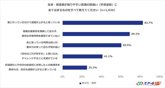 他にも、教室長・講師の53.4%が「基礎学習が抜けているのに、応用演習を繰り返している」と回答した一方、学生は22.2%、保護者は17.3%にとどまりました。