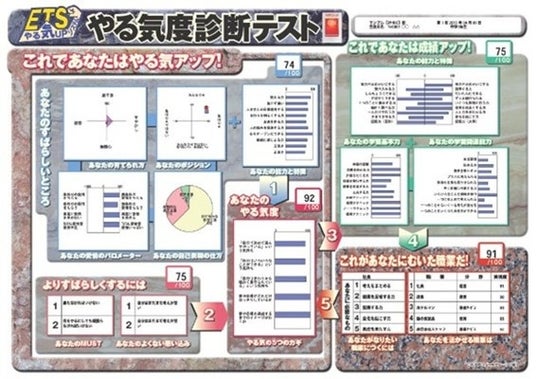 スクールIEが独自開発した個性診断テスト(ETS)は、およそ200問の設問に回答することで子どもの学習習慣や生活習慣だけではなく、強みや能力、自己表現の仕方などといった子どもの個性まで細かく分析します。分析結果をもとに一人ひとりに合わせた最適な勉強方法、努力の仕方を提案します。