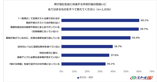 成績が伸び悩む生徒に多い学習計画について、スクールIEの教室長・講師に聞いたところ、最も多かったのは「『一夜漬け』で定期テストは乗り切れるが、模試や実力テストで点が取れない」で60.1%にのぼりました。