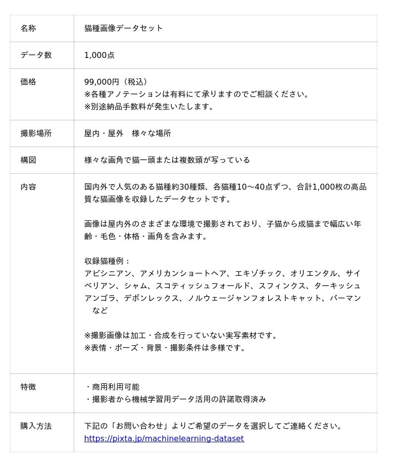ピクスタ株式会社(東京都渋谷区 代表取締役社長:古俣大介、東証スタンダード:3416)が運営する写真・イラスト・動画・音楽素材のマーケットプレイス「PIXTA(ピクスタ)」は、「機械学習用画像・動画データ提供サービス」として、「猫種画像データセット」を販売いたします。