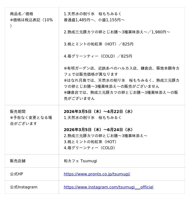 飲食チェーン『PRONTO(プロント)』や『È PRONTO(エ プロント)』などを展開する株式会社プロントコーポレーション(本社:東京都港区、代表取締役社長:杉山和弘)は、『和カフェ Tsumugi(以下、ツムギ)』にて、「天然水の削り氷 桜もちみるく」を発売します。また、同日より期間限定のお膳メニューとドリンク2種も登場いたします。