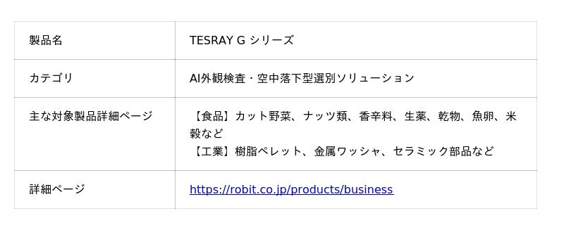 AI・ソフト・ハードを融合させたクロスソリューションを提供する株式会社ロビット(本社:東京都板橋区、代表取締役:橋本 優希、以下「ロビット」)が提供する、外観検査自動化ソリューション「TESRAY G シリーズ」が、RobotsTown株式会社が運営する食品業界特化型データベースサイト「FOOD TOWN」の「検査・検品」部門において、プロダクトランキング第1位を獲得したことをお知らせいたします。