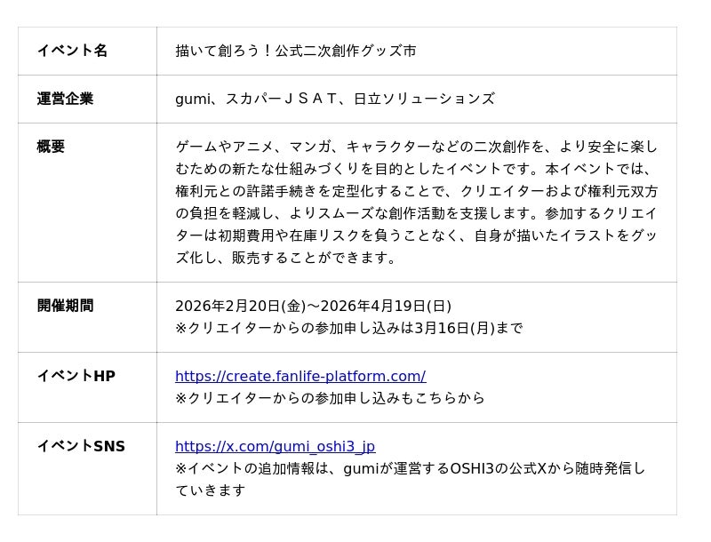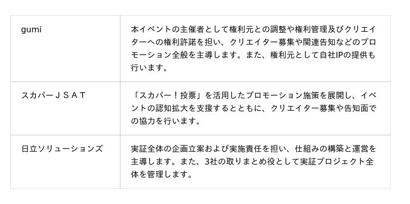 IPビジネスに精通し、新たな推し活経済圏の構築を図るプロジェクト「OSHI3」を推進するgumi、クリエイター及び権利元の課題解消に向け、IP流通やクリエイターエコノミー支援に取り組むスカパーJSAT、そしてファンクラブ向け会員サイトの構築や運営に豊富な実績を持つ日立ソリューションズの3社が、それぞれの知見を持ち寄り、協創事業としてクリエイター支援に取り組むこととなりました。