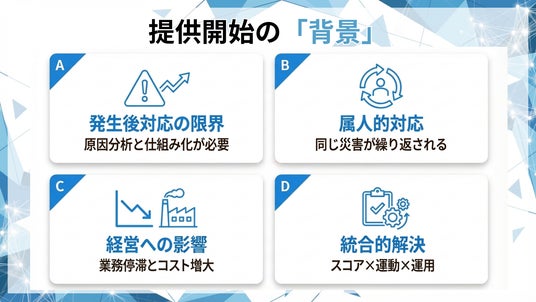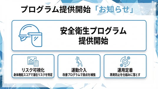 当社は、安全衛生管理の実務として、体の状態をスコア化して見えないリスクを可視化し、改善するための運動介入と運用設計を一体で提供することで、再発防止を定着させる支援を提供開始します。