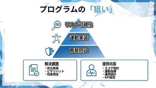 本プログラムは、労災の潜在リスクを身体機能スコアで可視化し、スコアに応じた改善運動と運用設計を一体で実装する安全衛生支援です。