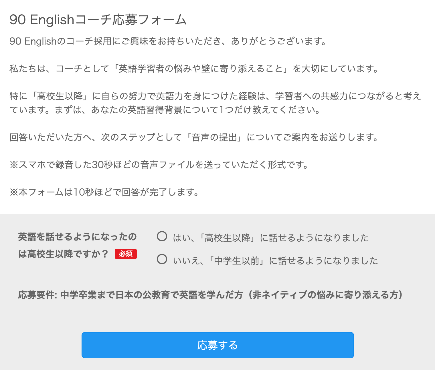 採用条件である「中学卒業まで日本の学校で英語を学び、高校生以降に英語を話せるようになった方」かどうかを確認する質問のみです。志望動機・英語スコア・履歴書の提出は不要。お名前や職業、志望動機などは面接前アンケートにてご記入いただきます。
