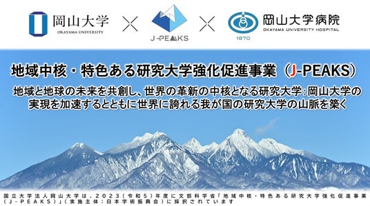 - 岡山大学 文部科学省「地域中核・特色ある研究大学強化促進事業(J-PEAKS)」に採択~地域と地球の未来を共創し、世界の革新の中核となる研究大学:岡山大学の実現を加速とともに世界に誇れる我が国の研究大学の山脈を築く~