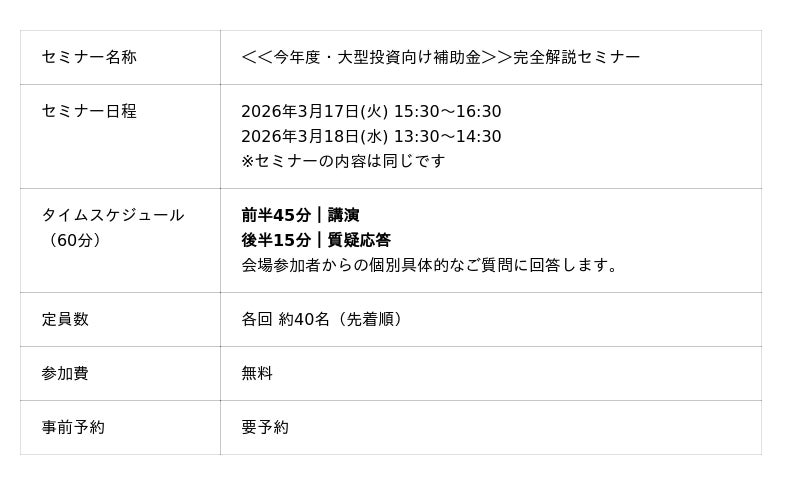 2026年3月17日(火)・18日(水)開催、大型設備投資を検討する企業に向けた補助金の活用をご提案