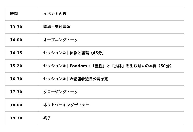 ローカル/ファンダム/インダストリアルという3つのテーマごと、思想、歴史、技術と多岐にわたって知見を持つ仏教僧・起業家らが登壇します。