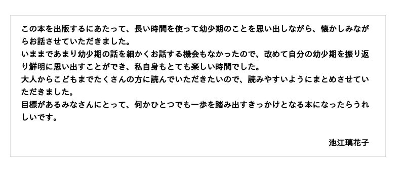 巻末には、「池江璃花子選手に質問」「りかこのプロフィール」や、池江さんからのメッセージ「夢をかなえたいキミたちへ」も収録し、現在進行中で活躍する池江選手の素顔に迫るページも収録。