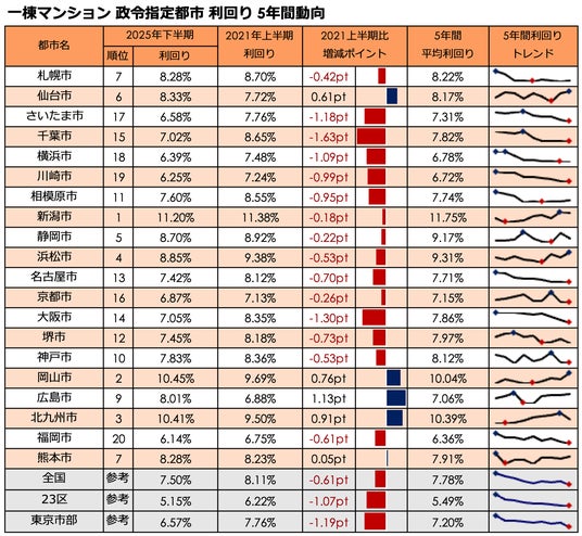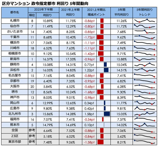 事業を通して社会課題解決に取り組む株式会社LIFULLのグループ会社であり、不動産投資と収益物件の情報サイト「健美家(以下、健美家)」および「LIFULL HOME'S 不動産投資」を運営する健美家株式会社(代表取締役社長:成瀬 亮輔)は、2025年7月~12月期に登録された全国の住宅系収益不動産3種別(区分マンション・一棟アパート・一棟マンション)を集計し、政令指定都市別の利回りを「政令指定都市 高利回りランキング」として公開しました。