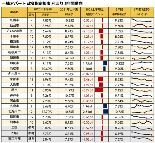 新潟市が全種別で利回り1位を堅持。5年間動向では北九州(区分・一棟アパ)や広島(一棟マン)の上昇が最大。健美家 「2025年下半期 政令指定都市 住宅系収益不動産 高利回りランキング」