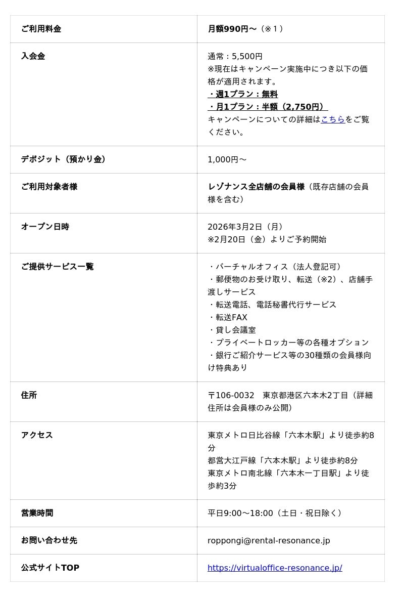 ※本キャンペーンは「レゾナンス六本木店」を含むレゾナンス全店舗、およびすべてのバーチャルオフィスプランが対象です。