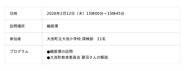2026年2月10日に大洗小学校で開催された上映会を経て、この度、物語の舞台を実地で学ぶフィールドワークを実施いたしました。参加したのは、同校「探検部」の児童11名。民話「織姫塚」が生まれた背景にある地域の自然環境と、物語に込められた先人たちの“教え”を深く理解することが目的です。