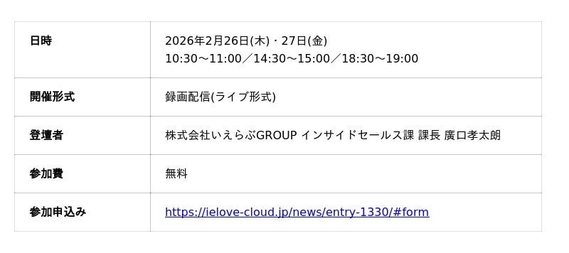 不動産業界特化のDX支援サービスを展開する株式会社いえらぶGROUP(本社:東京都新宿区、代表取締役:岩名泰介、以下「いえらぶGROUP」)は、2月26日(木)・27日(金)の2日間、録画配信(ライブ形式)にて、「人手を増やさず売上を伸ばす!成功し続けるセールス組織の変革方法」セミナーを開催いたします。