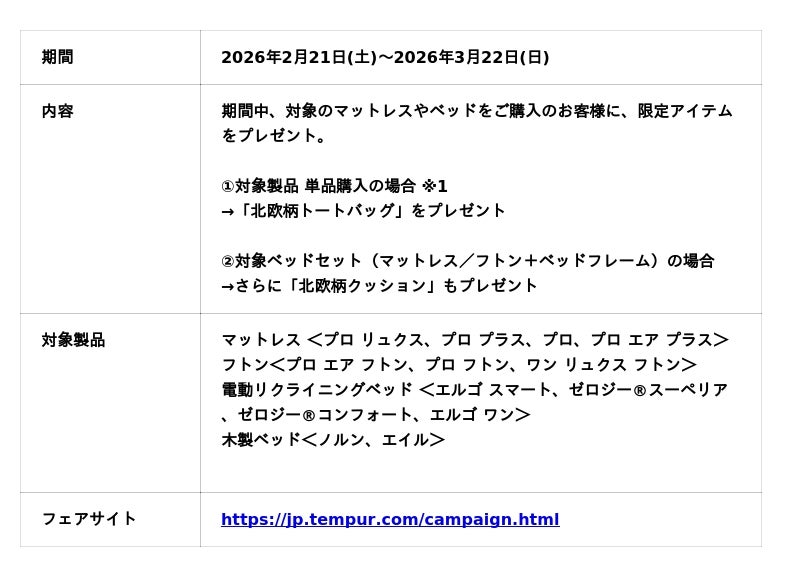 「新生活フェア」特設サイト:https://jp.tempur.com/campaign.html