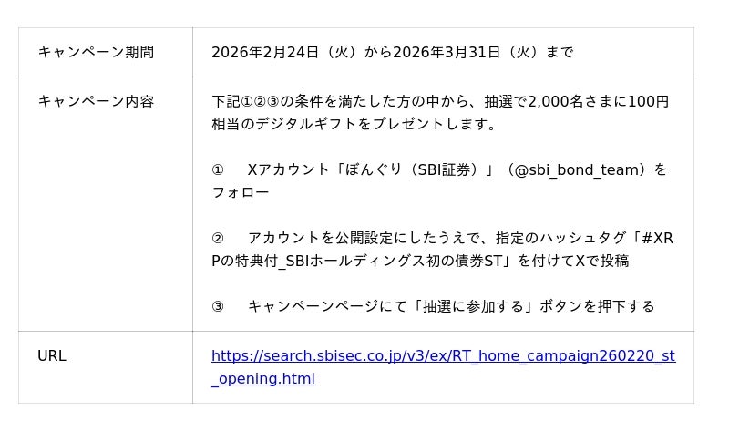 当社では、本ST社債の販売を記念して、2026年2月20日(金)から2026年3月31日(火)までの期間で、「もれなく100円プレゼント!ST(セキュリティ・トークン)取引口座開設キャンペーン」、「抽選で2,000名さまに!Xをフォロー&指定のハッシュタグ付き投稿で100円相当のデジタルギフトが当たる」および「現金10,000円当たる!債券購入応援キャンペーン」の各種キャンペーンを実施します。