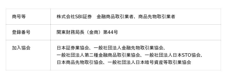 SBI証券で取り扱っている商品等へのご投資には、商品毎に所定の手数料や必要経費等をご負担いただく場合があります。また、各商品等は価格の変動等により損失が生じるおそれがあります(信用取引、先物・オプション取引、商品先物取引、外国為替保証金取引、取引所CFD(くりっく株365)、店頭CFD取引(SBI CFD)では差し入れた保証金・証拠金(元本)を上回る損失が生じるおそれがあります)。各商品等への投資に際してご負担いただく手数料等及びリスクは商品毎に異なりますので、詳細につきましては、SBI証券WEBサイトの当該商品等のページ、金融商品取引法等に係る表示又は契約締結前交付書面等をご確認ください。