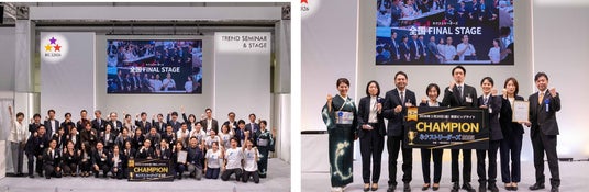 「ネクストリーダーズ2025」全国FINAL STAGE 出場者と審査員(左)、チャンピオンになった「マーラータン」(福岡代表)のメンバー(右)
