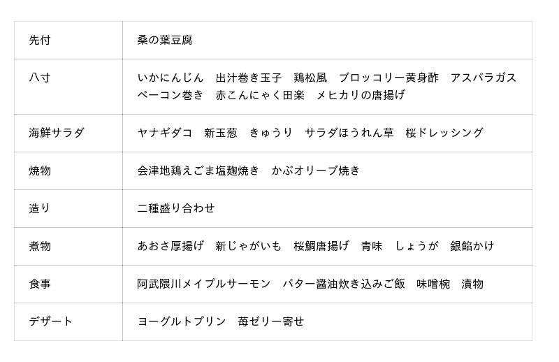 八寸では、いわき市の「市の魚」にも認定されている、皮が薄くふんわりとした柔らかい食感の“メヒカリ”を、骨ごと召し上がっていただけるように唐揚げにしてご用意いたします。サラダでは、濃厚な旨みと肉厚な身の“ヤナギダコ”を、春らしく桜風味のドレッシンに合わせました。焼物では、塩麹に漬けてより柔らかく旨みが引き出された会津地鶏と、みずみずしい中にコクのある福島県産のかぶをお楽しみいただけます。福島県産のあおさを練り込んだ厚揚げの煮物や、バター醤油で焼いた阿武隈川メイプルサーモンの身をほぐしたご飯、福島県産の苺ゼリーなど、ランチでも魅力溢れる食材をしっかりと感じていただる御膳になっています。