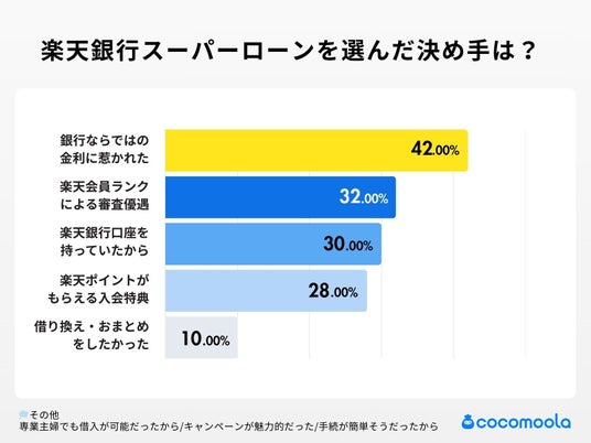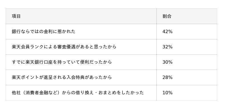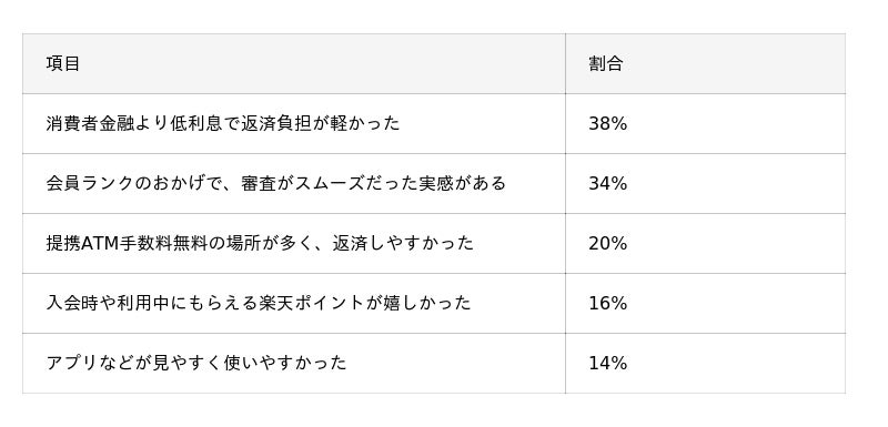 - 選択理由として最も多かったのは「銀行ならではの金利に惹かれた」(42%)。次いで「楽天会員ランクによる審査優遇があると思ったから」(32%)が続き、楽天ユーザー特有の金利・審査面でのメリットが強いフックとなっている。満足点でも「会員ランクのおかげで審査がスムーズだった」(34%)との声が多く、会員であるメリットを実感している様子がうかがえる。