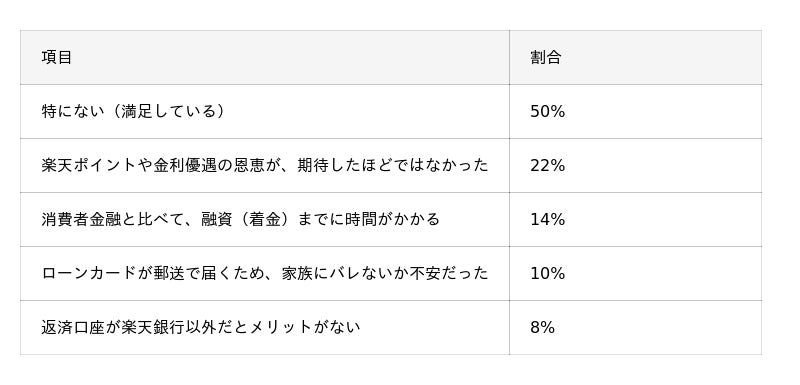 - 楽天銀行スーパーローンの利用者のうち、不満点が「特になし(満足している)」と回答した人は50%に達し、半数のユーザーが高い満足度を感じている結果となった。