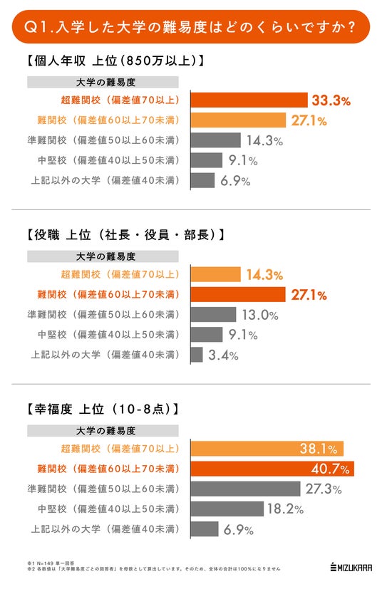 調査の結果、大学の難易度と個人年収や社会的地位、幸福度には一定の相関があることが確認できました。受験追い込みの「今」のもうひと踏ん張りは、決して無駄にはなりません。ただこれはあくまで傾向値として捉えるべきデータであり、大学の難易度で人生が決まるわけではありません。「超難関校」と「難関校」では役職や幸福度は逆転しているなど、必ずしも無理して難易度の高い大学を目指すこと=正解とは言い切れないようです。