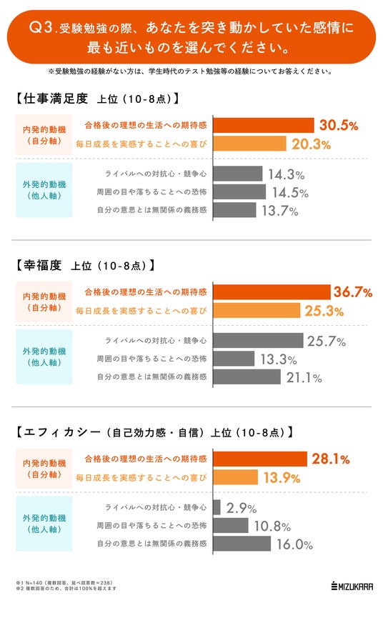調査の結果、受験期間に得た努力習慣や自信、また勉強する「原動力」の置きどころがその後の人生の幸福度や仕事満足度、エフィカシー(自己効力感・自信)に大きな影響を与えることが確認できました。