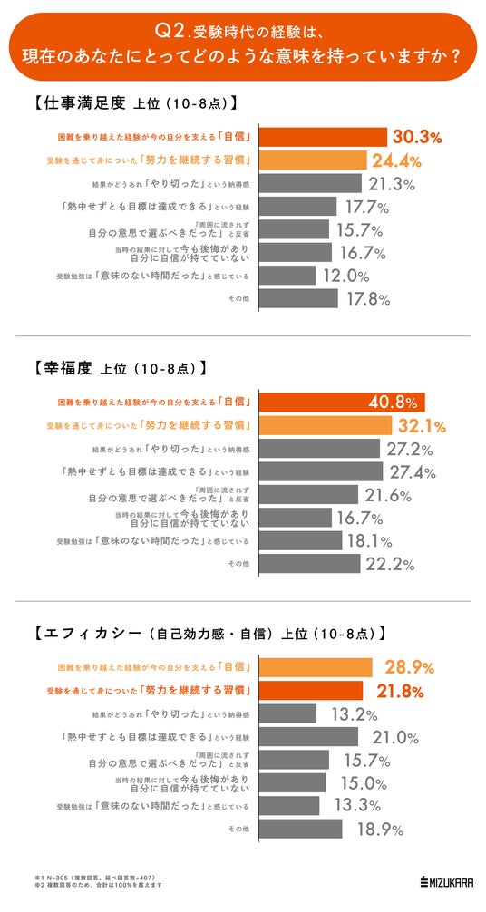 調査の結果、受験時代に困難を乗り越えて結果をつかみ取った「成功体験」を人生を支える「自信」に振り替えられた人、またその時の経験から「努力を継続する習慣」が身に付いた人は、大人になっても仕事満足度・幸福度・エフィカシー(自己効力感・自信)ともに高い傾向が確認できました。逆に受験をやり切っていない人やシニカルな態度をとった人はそれらの数値が低い傾向がみられます。