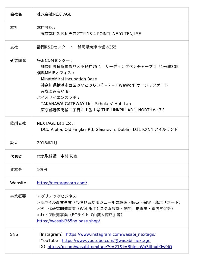株式会社NEXTAGE - 代表取締役 中村拓也今回の取り組みは、当社にとってわさび栽培技術開発という事業の延長線だけではなく、新たな産業モデルを創り出すための本質的な挑戦だと位置づけています。