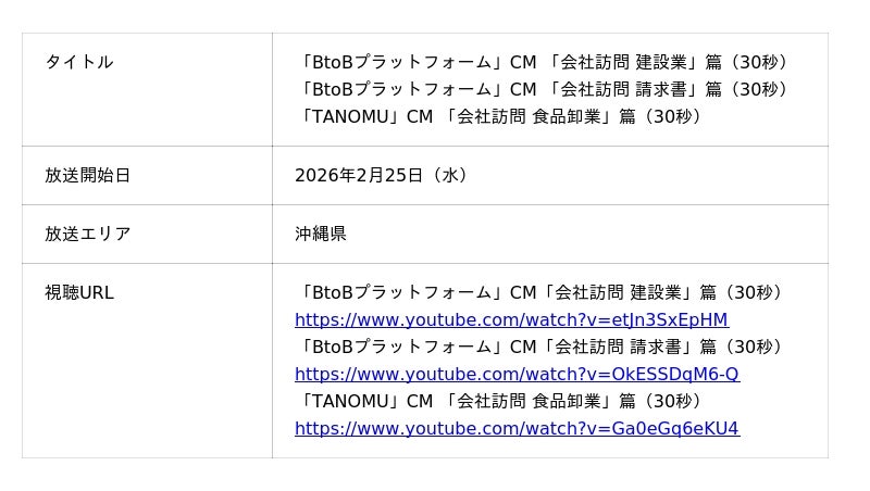 当社は1998年の創業以来、「BtoBプラットフォーム」を通じて、企業間商取引のデジタル化を牽引してきました。近年では「TANOMU」の提供も開始するなど、バックオフィス業務の効率化支援をさらに加速させています。2024年4月の沖縄営業所開設を経て、同年9月よりテレビCMを開始。前回の第2弾(※)では、建設業・宿泊業・飲食業の「あるある」な悩みに着目し、多くの県内企業から共感の声をいただきました。