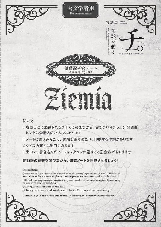 「地動説研究ノート」を片手に、謎を解き明かそう!会場入り口で配布される「地動説研究ノート」を手に、本展を巡りながら、各所に散りばめられた問題をクリアすると、本展限定のオリジナルステッカーをプレゼント。