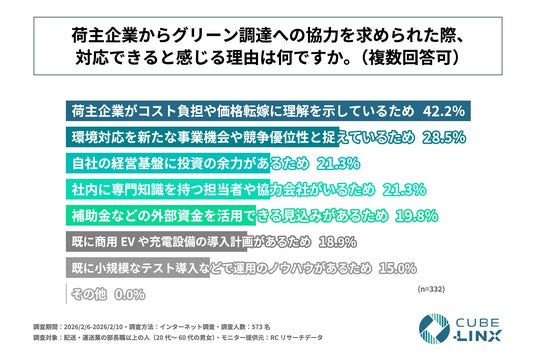 次に、荷主企業からのグリーン調達の協力要請に対応できると感じる人を対象に「荷主企業からグリーン調達への協力を求められた際、対応できると感じる理由は何だと思うか」を尋ねる設問への回答では、1位が「荷主企業がコスト負担や価格転嫁に理解を示しているため」で42.2%、2位が「環境対応を新たな事業機会や競争優位性と捉えているため」で28.5%、3位が同率で「自社の経営基盤に投資の余力があるため」と「社内に専門知識を持つ担当者や協力会社がいるため」で21.3%という結果になりました。この結果から、荷主企業からのグリーン調達の協力要請に対応できると感じる人が、荷主企業からのグリーン調達の協力要請に対応できると感じる主な理由は「荷主企業がコスト負担や価格転嫁に理解を示しているため」や「環境対応を新たな事業機会や競争優位性と捉えているため」であることがわかりました。