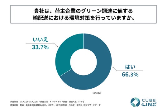 また、荷主企業からのグリーン調達の協力要請に対応できると感じる人を対象に、「自社は荷主企業のグリーン調達に値する輸配送における環境対策を行っているか」を尋ねる設問への回答では、「はい」が66.3%、「いいえ」が33.7%という結果になりました。この結果から、荷主企業からのグリーン調達の協力要請に対応できると感じる人の約3人に1人が、自社では荷主企業のグリーン調達に値する輸配送における環境対策を行っていないと回答したことが明らかになりました。