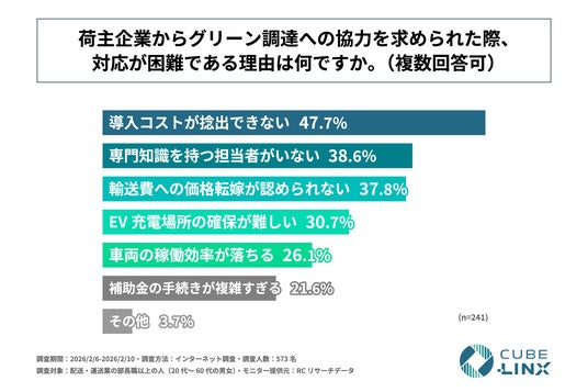 荷主企業からのグリーン調達の協力要請に対応できないと感じる人の、その理由のトップ3は、1位「導入コストが捻出できない」、2位「専門知識を持つ担当者がいない」、3位「輸送費への価格転嫁が認められない」