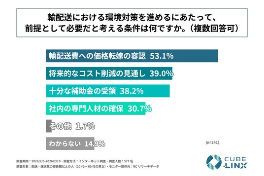 調査の最後、荷主企業からのグリーン調達の協力要請に対応できないと感じる人を対象に「輸配送における環境対策を進めるにあたって、前提として必要だと考える条件は何か」を尋ねる設問への回答では、1位が「輸配送費への価格転嫁の容認」で53.1%、2位が「将来的なコスト削減の見通し」で39.0%、3位が「十分な補助金の受領」で38.2%という結果になりました。この結果から、荷主企業からのグリーン調達の協力要請に対応できないと感じる人の半数以上が、輸配送における環境対策を進めるにあたって「輸配送費への価格転嫁の容認」を前提条件だと考えていることがわかりました。