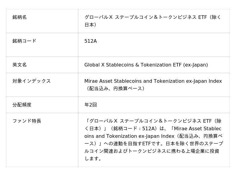 「グローバルX ステーブルコイン&トークンビジネス ETF(除く日本)」(銘柄コード:512A)