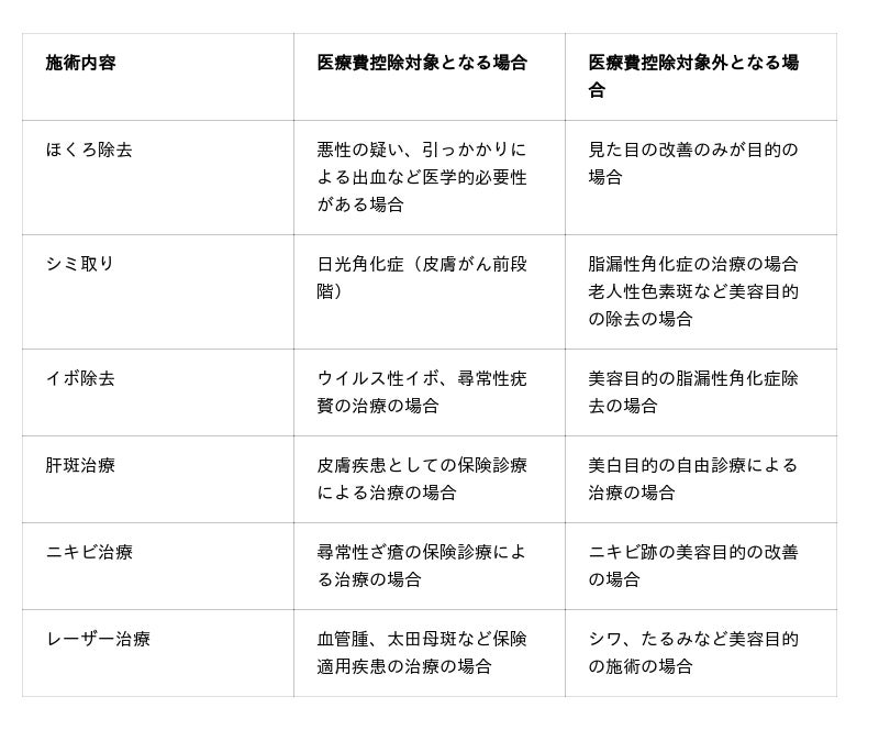美容皮膚科の施術における医療費控除対象の比較