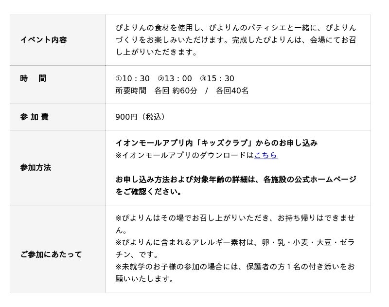 つくって楽しい、食べておいしい!「ぴよりん」手づくり体験を「イオンモール浜松志都呂」「イオンモール浜松市野」にて開催決定