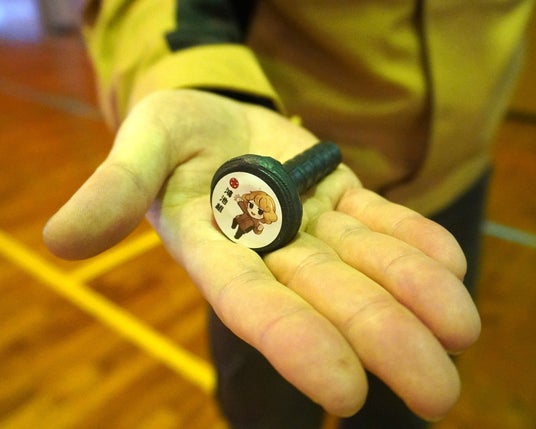 鴻池組のパートでは、現場で使用した建設材料(鉄筋)と同じものを加工して製作したペーパーウェイトを、ノベルティとして生徒に配布しました。配布したペーパーウェイトに使われた材料が実際の工事で使用される様子を紹介し、工事を身近に感じてもらいました。