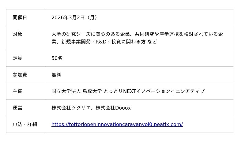 『緊急ではないけれど、重要な課題』について、企業経営者に伴走する特命社長室(R)︎を展開する株式会社Dooox(本社:東京都品川区、代表:久保寺亮介/以下「当社」)は、国立大学法人鳥取大学(所在地:鳥取県鳥取市、学長:原田省)の学内組織「とっとりNEXTイノベーションイニシアティブ」が新たに企画する産学連携プログラム「鳥取大学 Open Innovation Caravan(オープンイノベーション・キャラバン)」の運営を株式会社ツクリエと共同で担い、そのvol.0を2026年3月2日(月)に大阪市内の2会場にて開催いたします。鳥取大学の研究者が自ら大阪へ出向き、参加企業に対して研究シーズを直接プレゼンテーション。事業化・連携に向けた意見交換やネットワーキングを行う、キャラバン型・産学連携の新シリーズです。