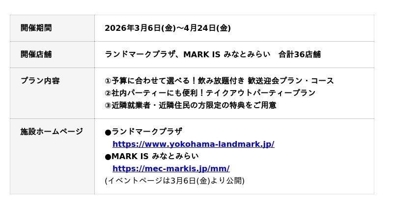 また、同時開催で両施設の人気飲食店から春の歓送迎会向けの「宴会プラン」を展開します。職場の送別会・歓迎会はもちろん、社内パーティーや気軽な懇親会まで、幅広いシーンに対応できる多彩なメニューをご用意しました。