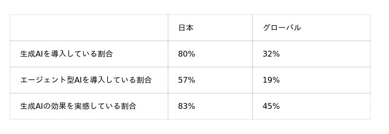 このため、日本のAI導入率は、企業規模や業界構成の違いが一定程度影響している可能性があります。「グローバル平均」は、日本を除く6カ国/地域(北米、英国、フランス、ドイツ、オーストラリア、インド)における調査結果の平均値を示しています。