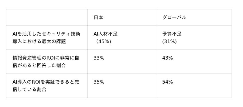 情報資産の保護と管理に関するROIを測定する能力に「非常に自信を持っている」と回答した割合は、わずか33%(グローバル:43%)と低い結果となりました。また、AI導入によるROI(投資収益率)を実証できると確信している日本企業はわずか35%で、グローバル(54%)と大きなギャップが明らかとなりました。