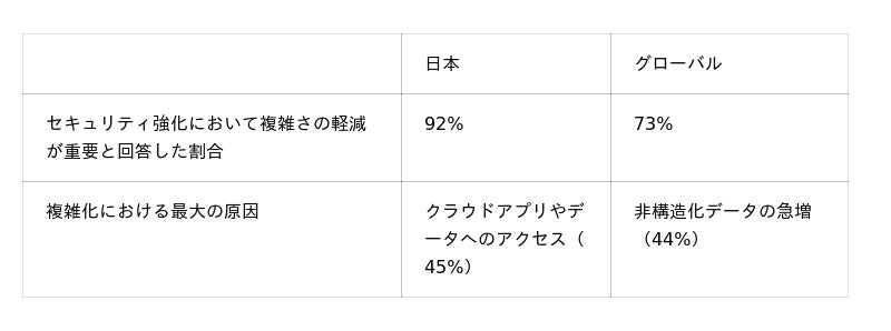 日本では回答者の92%(グローバル:73%)が、強力なセキュリティ体制構築のためには複雑さの軽減が重要であると回答しました。ITセキュリティアーキテクチャの複雑さの最大の原因として、グローバルでは非構造化データの急増(44%)が挙げられた一方、日本ではクラウドベースのアプリケーションやデータへのアクセス(45%)が最も多い結果となりました。