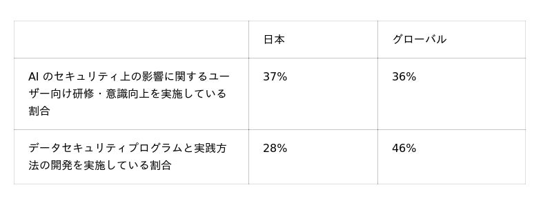 AIにおけるデータセキュリティリスクへの対策として、37%が、「AI のセキュリティ上の影響に関するユーザー向け研修・意識向上」を実施していると回答しました。しかし、グローバルで最も多かった「データセキュリティプログラムと実践方法の開発(46%)」を実施している回答者は28%にとどまりました。